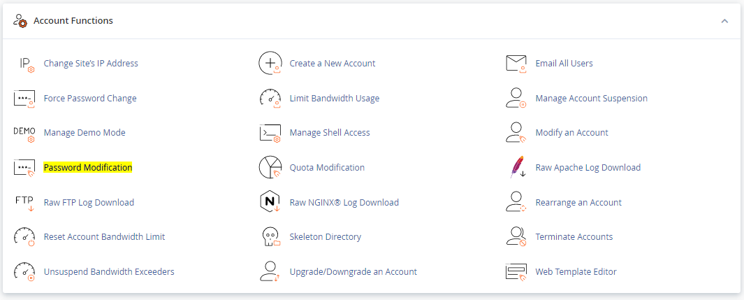 Once logged in, search for Account Functions on the left-hand side. Then click on Password Modification.